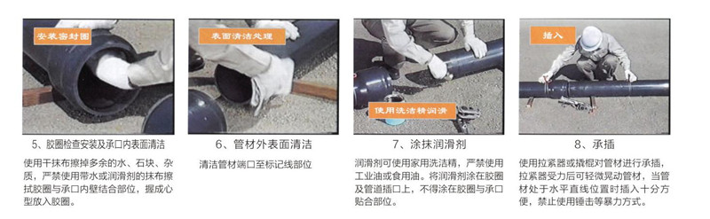 連接原理:通過帶彈性密封橡膠圈的管材、管件;來進行承插式連接,該工法隻能用於埋地安裝,有水壓時管材膨脹擠壓膠圈,水壓越大,膨脹越明顯,對膠圈的擠壓越緊,越不易漏水。