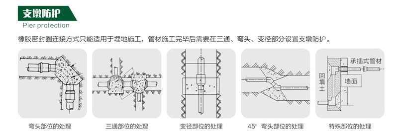 7、必須在埋設後,才能對彈性橡膠圈連接的管路進行水壓測(cè)試。不得已在埋設前進行水壓測(cè)試時,必須對管路結合部位採(cǎi)用防脫設施進行固定 ,如果不固定,會導緻管材脫出,非常危險。