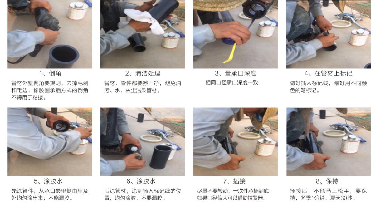 5、粘接接口不能在水中或雨中及0°C以下施工,橡膠(jiāo)圈接口不宜在-10°C以下施工,粘接施工工地嚴禁煙(yān)火。
